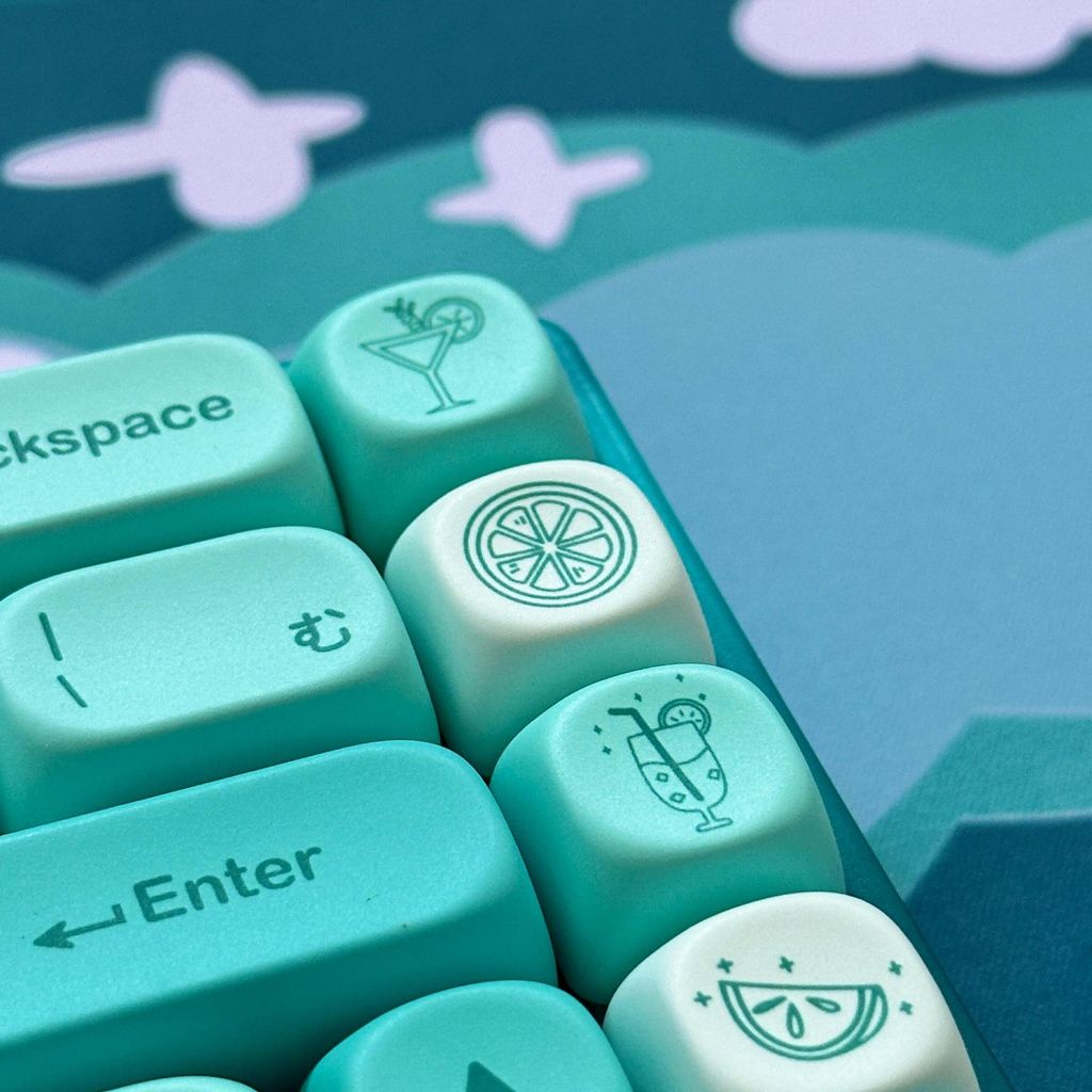 A tangy refreshment for your keyboard with vibrant citrus-inspired design. Brighten your typing experience with this Lime Zest MOA PBT Keycap set that transforms your keyboard into a sun-kissed lime grove. Featuring a lime green gradient base color accented with juicy fruit novelties, every keystroke feels as refreshing as a summer lime splash. The 125-key collection ensures full compatibility while the MOA profile delivers cloud-like typing comfort.